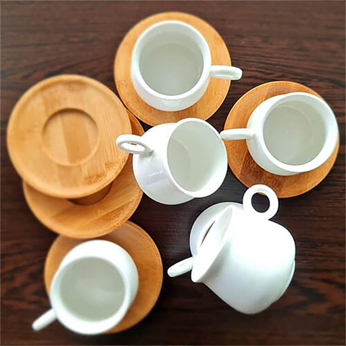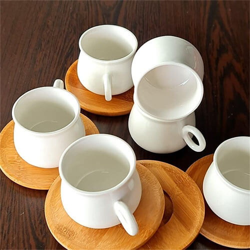 Das 12-teilige Ciftciler Kaffeetassen-Set ist ein wunderschönes Kaffeeservice für 6 Personen. Das hochwertige Porzellan ist in der Farbe Weiß gehalten und besteht aus 6 Kaffeetasse mit Untertasse. Das Set ist spülmaschinenfest und kann daher ganz einfach gereinigt werden. Das Kaffeeservice für 6 Personen ist die perfekte Ergänzung für Deine Küche. Die Untertassen sind aus hochwertigem Bambusholz gefertigt.